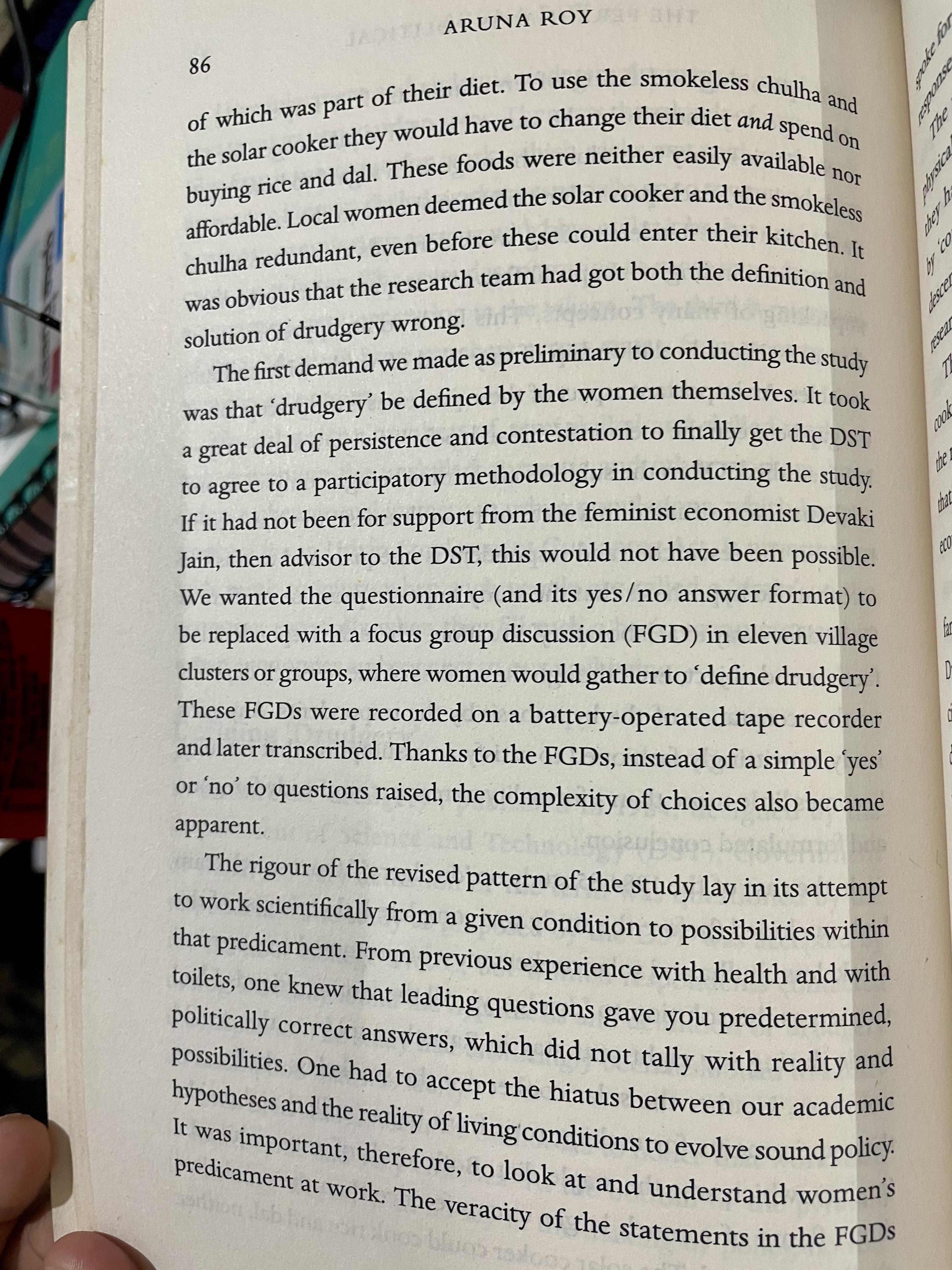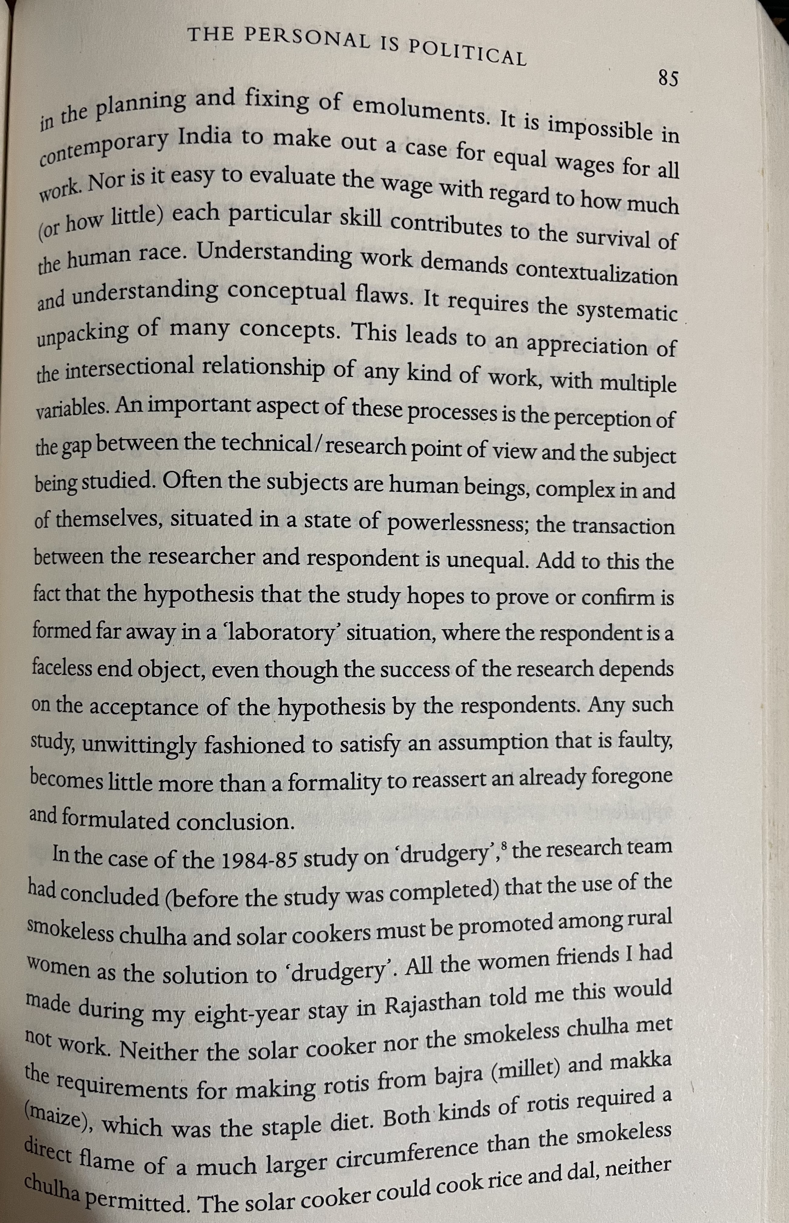 In the case of the 1984-85 study on ‘drudgery, the research team had concluded (before the study was completed) that the use of the smokeless chulha and solar cookers must be promoted among rural women as the solution to “drudgery’. All the women friends I had made during my eight-year stay in Rajasthan told me this would not work. Neither the solar cooker nor the smokeles chulha met the requirements for making rotis from bajra (mille) and maka (maize, which was the staple diet. Both kinds of rotis required s direct flame of a much larger circumference than the smokeless of which was part of their diet. To use the smokeless chulha and the solar cooker they would have to change their diet and spend on buying rice and dal. These foods were neither easily available no affordable. Local women deemed the solar cooker and the smokeless chulha redundant, even before these could enter their kitchen. It was obvious that the research team had got both the definition and solution of drudgery wrong.