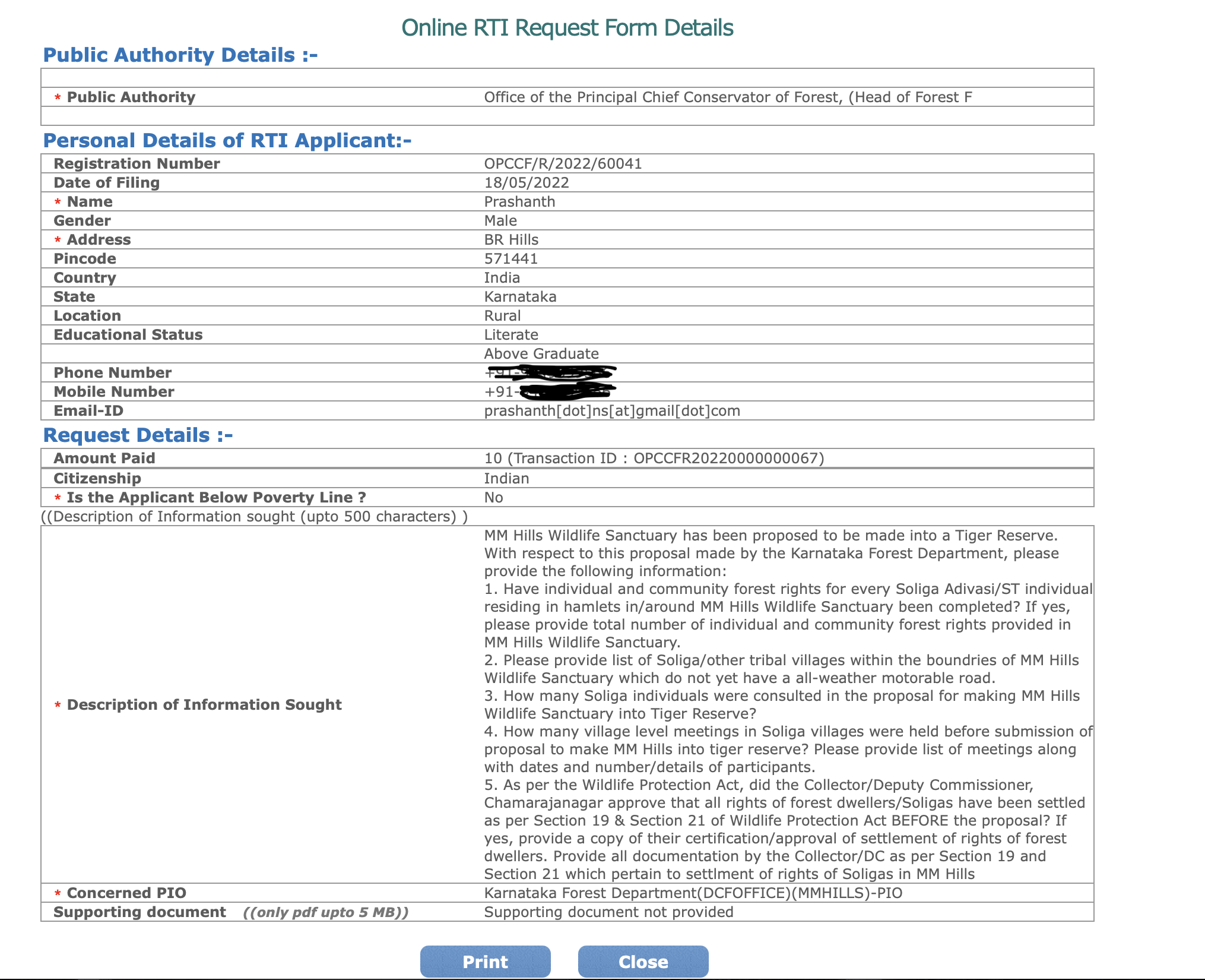 In 2022, on reading about the proposal from GoK to NTCA to upgrade MM Hills Wildlife Sanctuary into a Tiger Reserve, I had asked the following questions in an RTI application.